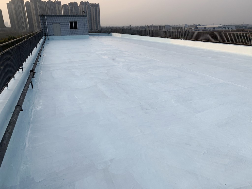 最終我們公司采取的方案是,采用我公司的聚合物防水涂料、SYR金屬屋面專用防水涂料配合專用縫織聚酯布進行施工,先針對屋頂的伸縮縫加強處理,然后再大面積施工,施工后的表層SYR金屬屋面專用防水涂料由于是專門針對裸露屋頂使用的,可以經受太陽直接暴曬,并且還具有反射隔熱作用,夏季屋頂降溫效果明顯。