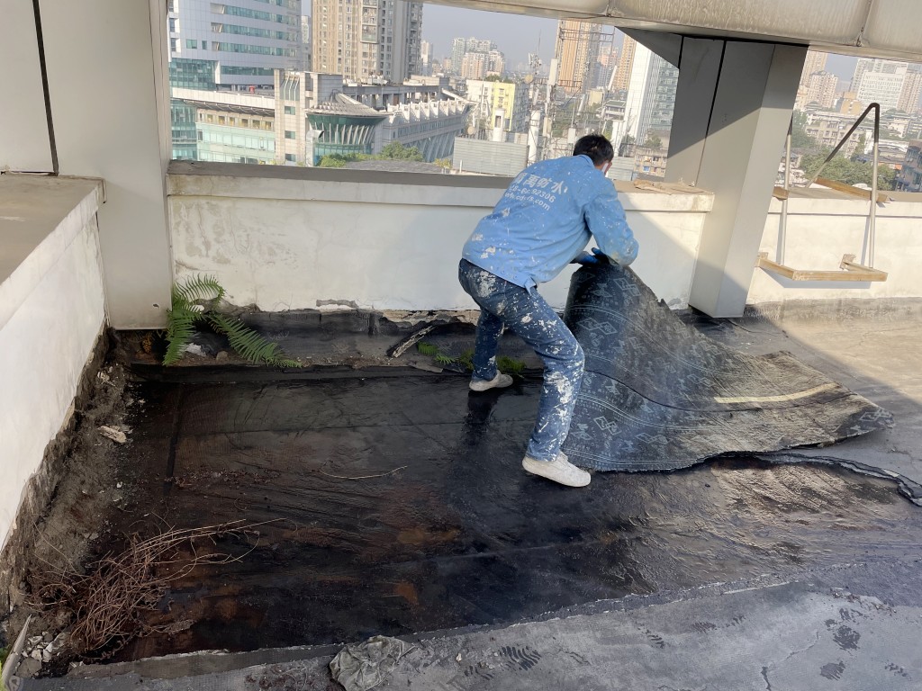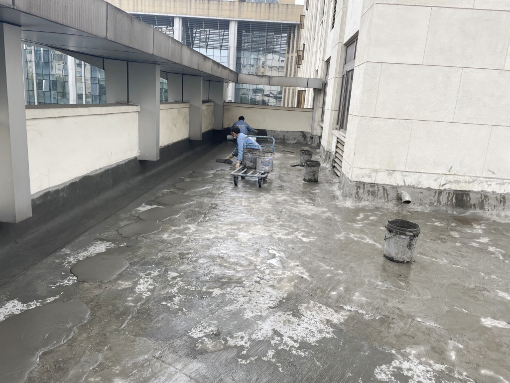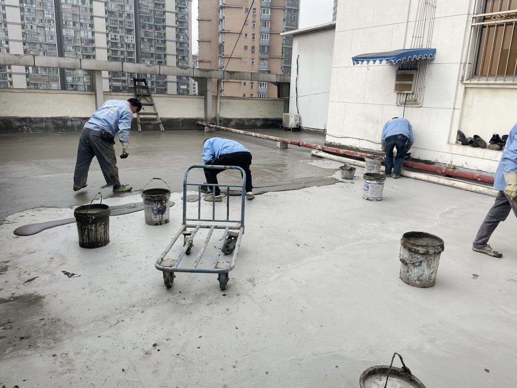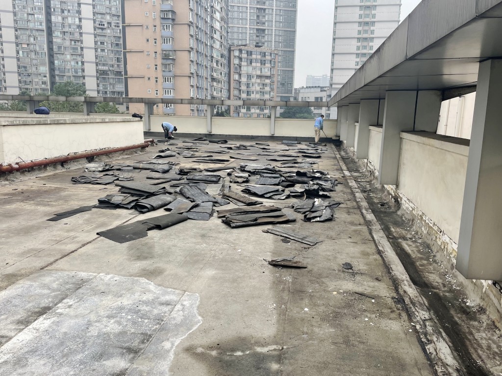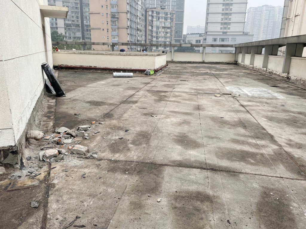 我公司承接的四川省人民代表大會常務(wù)委員會2號樓4樓裙樓屋面及8樓屋頂防水工程與2021年11月施工完成并經(jīng)過驗收合格,工程概況是我公司先實際查勘的屋面實際現(xiàn)場情況為,部分屋面為房屋修建時剛性屋面,4樓裙樓部分屋面在原有地面的基礎(chǔ)之上,后來又做了一層改性瀝青防水卷材,但是現(xiàn)在樓下屋頂還是有漏水點存在,這種現(xiàn)象分析原因是由于:屋頂本身有保溫層,保溫層是不防水的,水可以在保溫層內(nèi)到處竄,屋頂表面的防水卷材一些地方由于老化出現(xiàn)開裂的情況,水從表面裂縫位置滲入防水卷材下面,由于改性瀝青防水卷材底下與地面并沒有完全粘貼,水到了防水卷材底下之后就會向四周擴(kuò)散,導(dǎo)致防水卷材底下到處都是水,水?dāng)U散到防水卷材下面的地面有問題的地方時,再滲漏到保溫層內(nèi),最后從屋頂現(xiàn)澆板有薄弱的部位滲漏到樓下去了<注:屋頂現(xiàn)澆板本身是混凝土澆筑的,現(xiàn)澆板一般本身不會透水,但是現(xiàn)澆板澆筑時由于一些原因個別地方?jīng)]有澆筑好,水就會從那些沒澆筑好的薄弱部位漏到樓下,所以綜合上述原因分析,導(dǎo)致室內(nèi)屋頂滲水的水的來源可能并不是正對位置屋頂表面,可能是其他部位表面出現(xiàn)滲漏,然后竄水過來的。(我公司采取的方式是不將屋頂?shù)谋砻鎰傂詫尤坎鸪?/span>和將保溫層掏出,只需要將目前室內(nèi)漏水的位置對應(yīng)的屋頂位置局部敲開,先進(jìn)行局部堵漏修補(bǔ)處理,然后從局部敲開的位置以及將下水口位置敲開,從這些位置將屋頂保溫內(nèi)的多余積水清理掉即可,不用全部敲開這樣可以減小工程量,縮短施工工期,并且不會對對房屋的使用造成太大的影響,全部敲開的話往樓下搬運的建渣特別多,地面建渣堆放影響環(huán)境,并且施工周期大大延長,影響樓內(nèi)辦公人員工作,如果全部敲開時恰逢下雨的話,室內(nèi)將漏水區(qū)域大大增加,造成室內(nèi)短時間增加多處漏水情況,這樣會對室內(nèi)辦公造成更加嚴(yán)重的影響,故我公司只是局部敲開堵漏,從局部敲開的地方將多余的積水清理排出即可。)