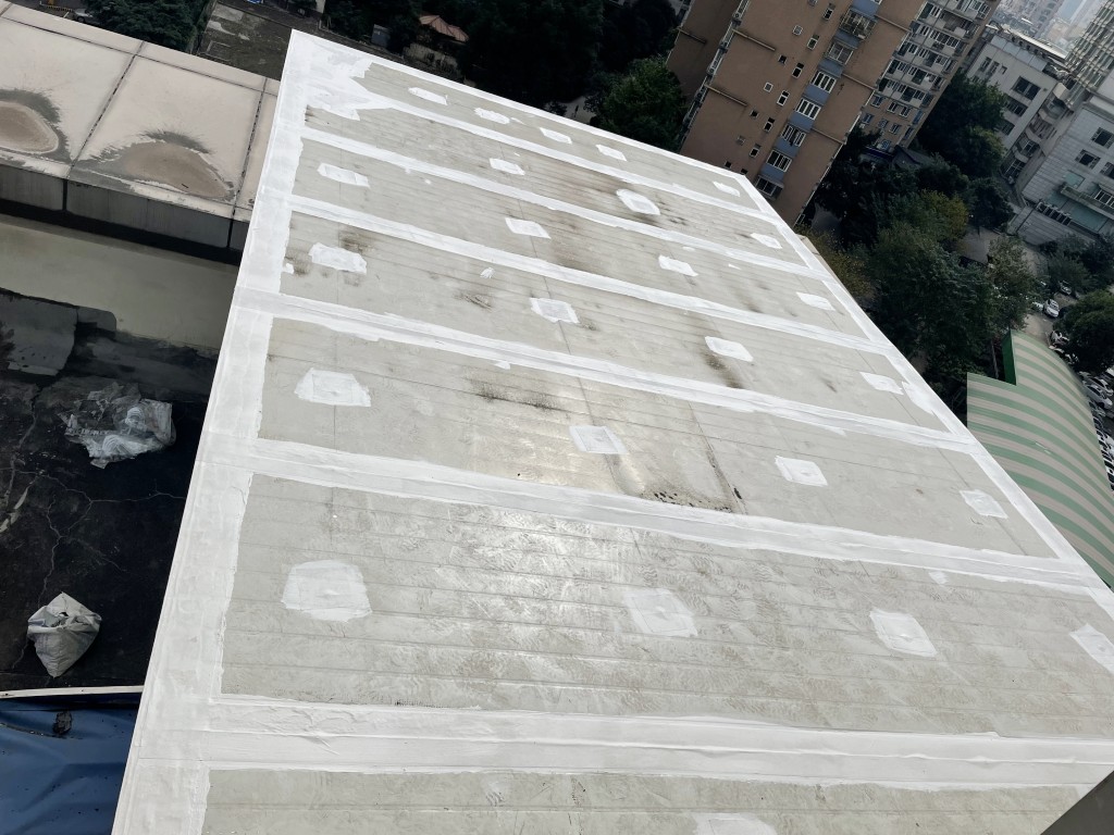 8樓屋頂搭建的三間小的彩鋼頂漏水情況是,彩鋼頂表面的彩鋼搭接縫及螺絲釘漏水,雨水從那些縫隙滲漏到室內(nèi)了,處理方法采用蜀禹SYR金屬屋面專用防水涂料配合專用縫織聚酯布進(jìn)行防水施工處理,先針對彩鋼搭接縫以及彩鋼與墻體交接縫進(jìn)行一布三涂防水處理,然后再整個彩鋼頂表面滿涂刷SYR金屬屋面專用防水涂料。