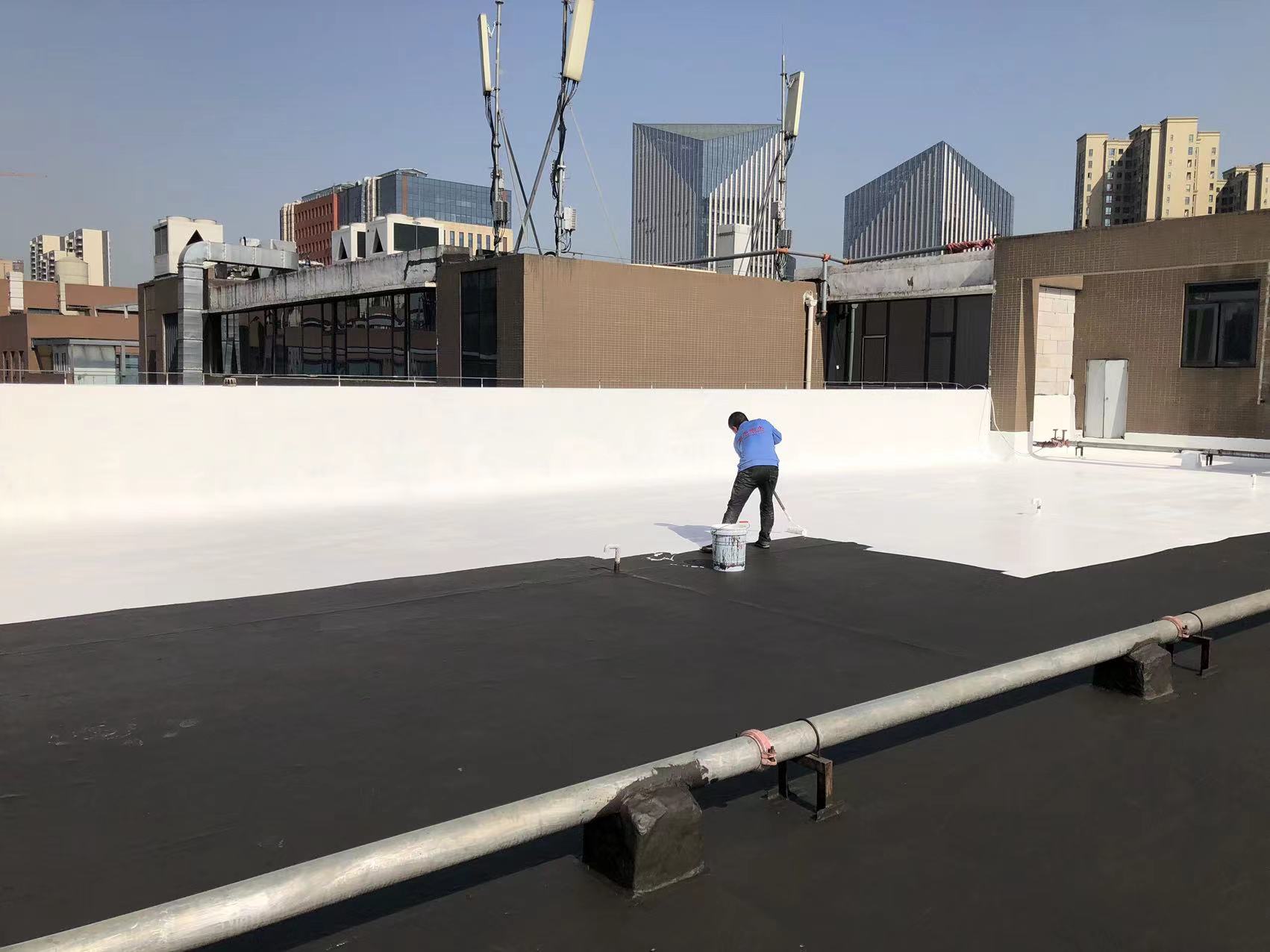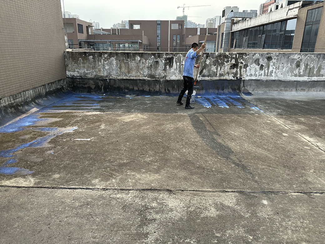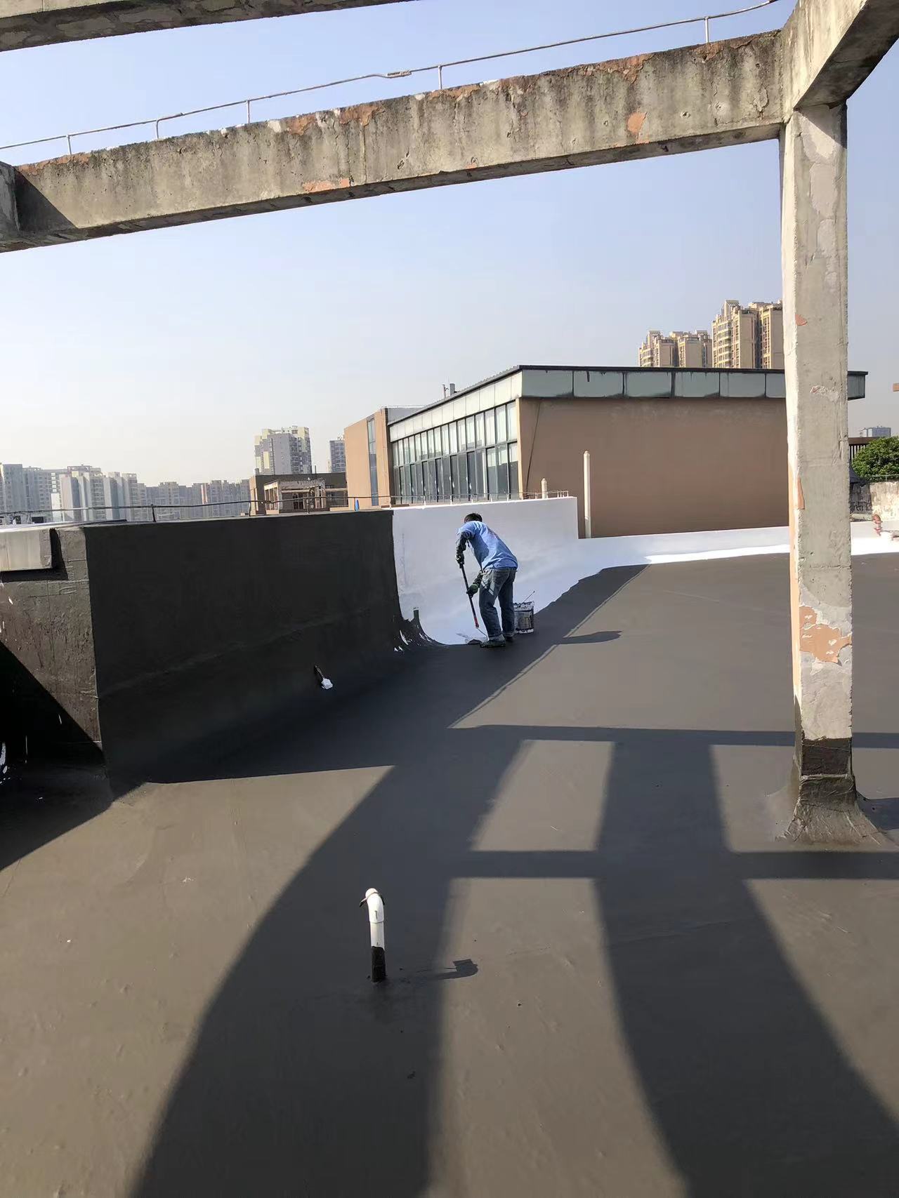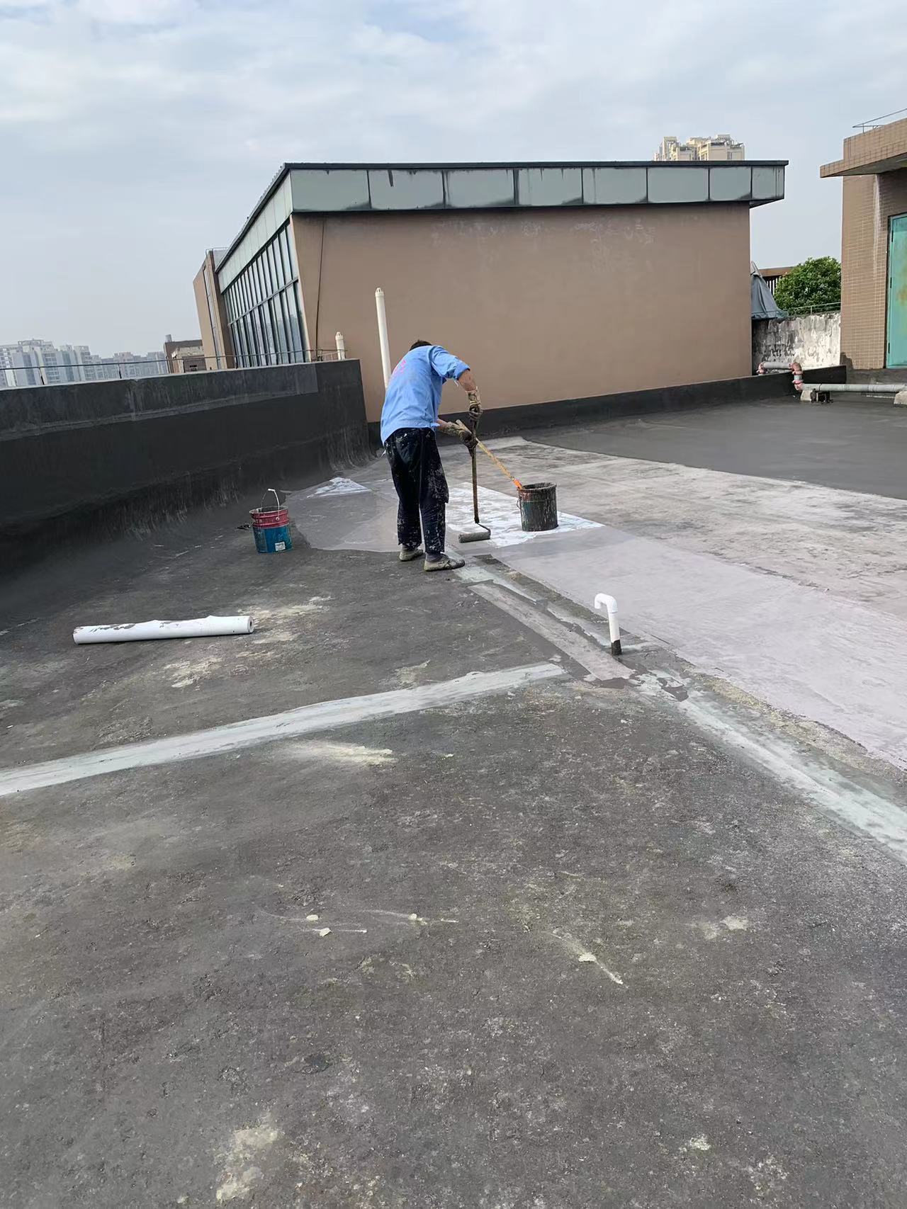 我公司現場施工工藝流程為:先將屋頂基層起殼易脫落的清理掉,破損部位水泥砂漿局部修補,然后基層表面滿涂刷混凝土液體硬化劑進行基層固化處理,這樣處理的好處是,后面做的防水層能夠與基層牢牢的粘結在一起;待混凝土液體硬化劑固化之后,屋頂的地面及墻面全部滿涂刷蜀禹Ⅰ型聚合物水泥防水涂料然后滿鋪貼專用的縫織聚酯布再涂刷蜀禹Ⅰ型聚合物水泥防水涂料,待干后表面涂刷蜀禹Ⅰ型聚合物水泥防水涂料,等待干后表面再涂刷兩道SYR金屬屋面防水涂料涂層。施工完畢之后,等待施工的防水涂層干透之后,屋頂做閉水試驗一星期后不漏水驗收合格之后交驗。