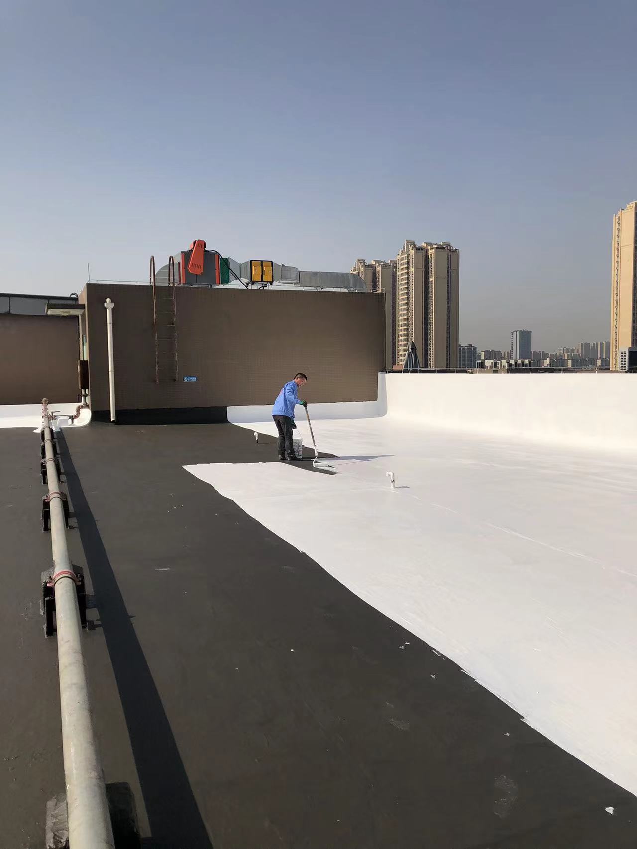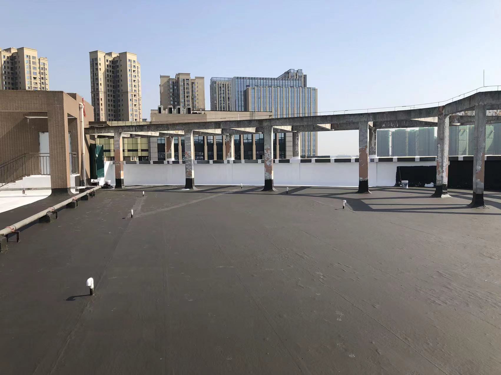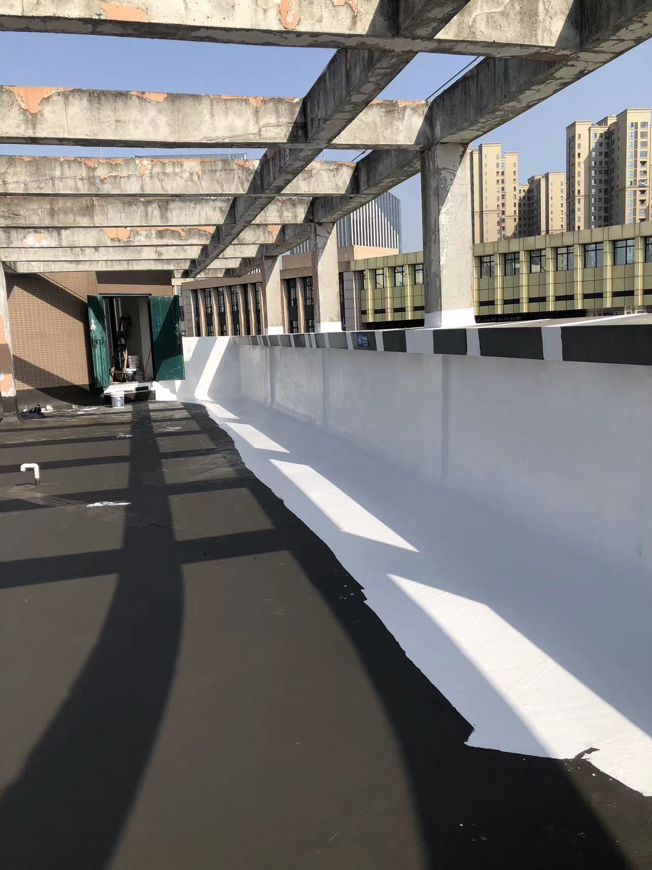我公司現場施工工藝流程為:先將屋頂基層起殼易脫落的清理掉,破損部位水泥砂漿局部修補,然后基層表面滿涂刷混凝土液體硬化劑進行基層固化處理,這樣處理的好處是,后面做的防水層能夠與基層牢牢的粘結在一起;待混凝土液體硬化劑固化之后,屋頂的地面及墻面全部滿涂刷蜀禹Ⅰ型聚合物水泥防水涂料然后滿鋪貼專用的縫織聚酯布再涂刷蜀禹Ⅰ型聚合物水泥防水涂料,待干后表面涂刷蜀禹Ⅰ型聚合物水泥防水涂料,等待干后表面再涂刷兩道SYR金屬屋面防水涂料涂層。施工完畢之后,等待施工的防水涂層干透之后,屋頂做閉水試驗一星期后不漏水驗收合格之后交驗。