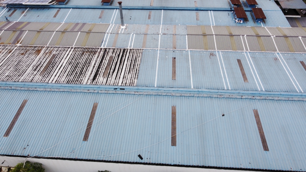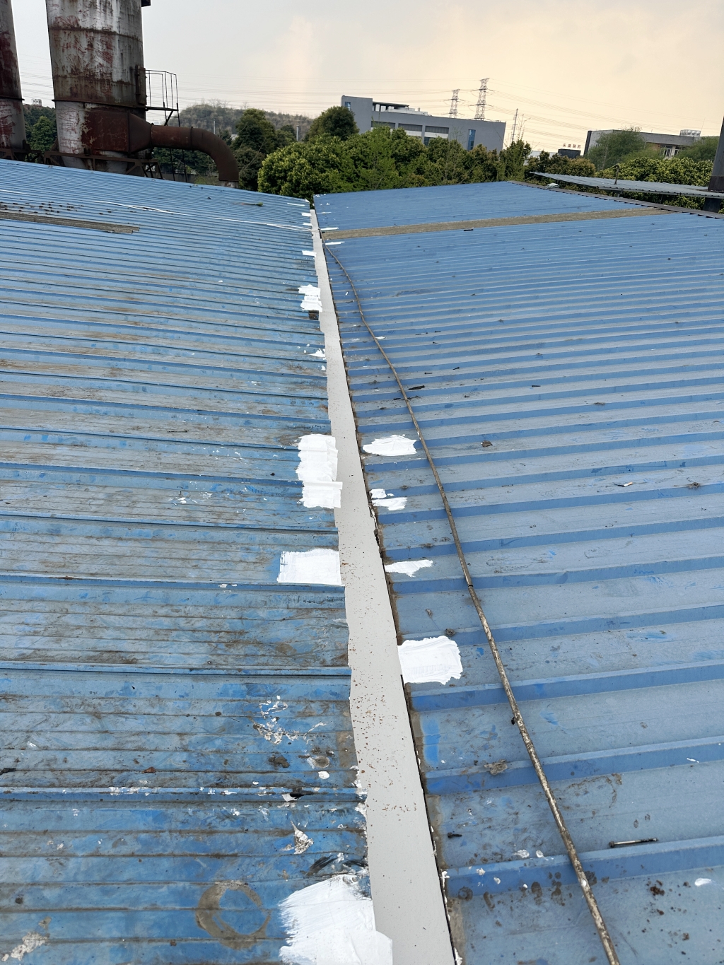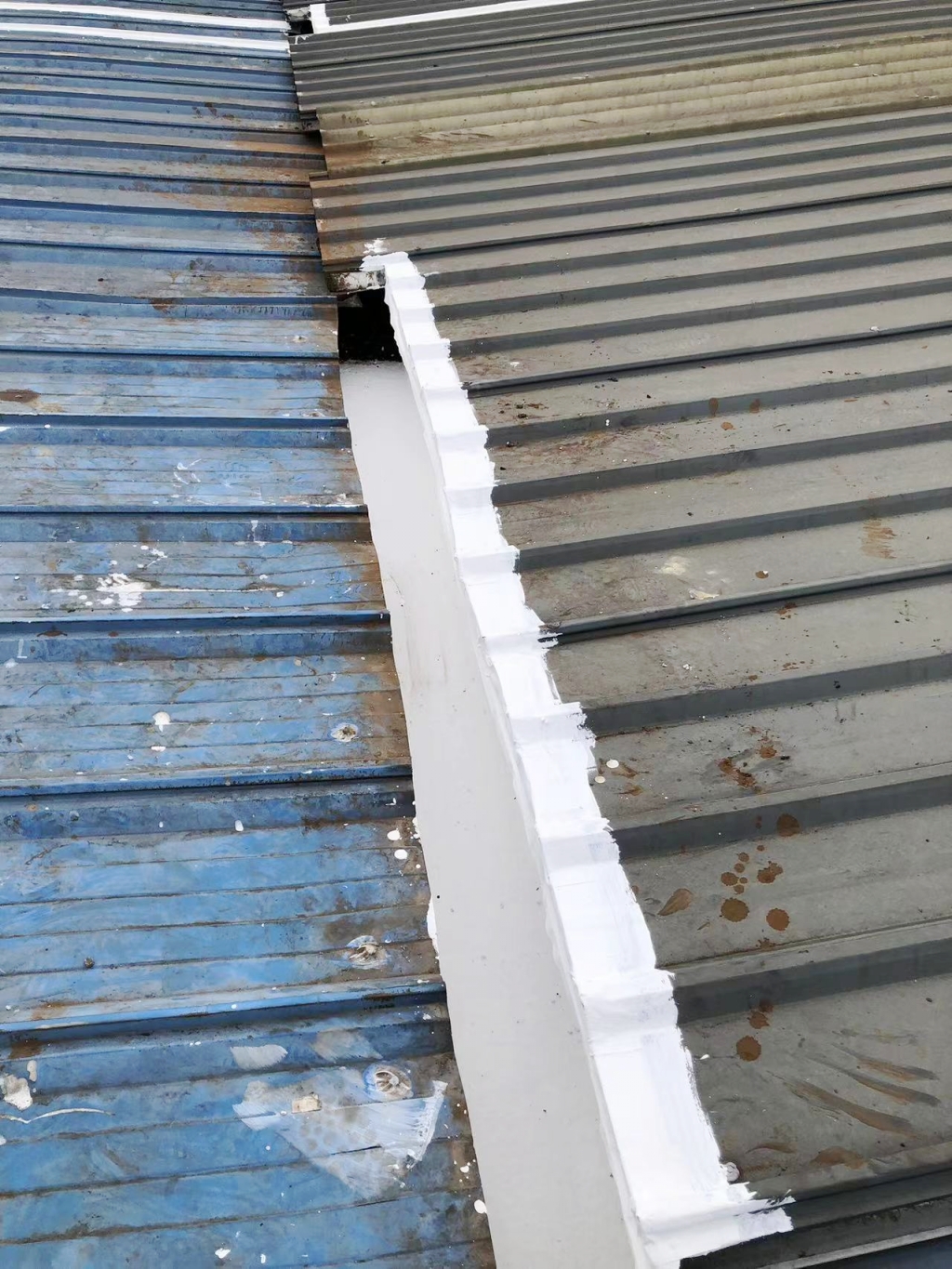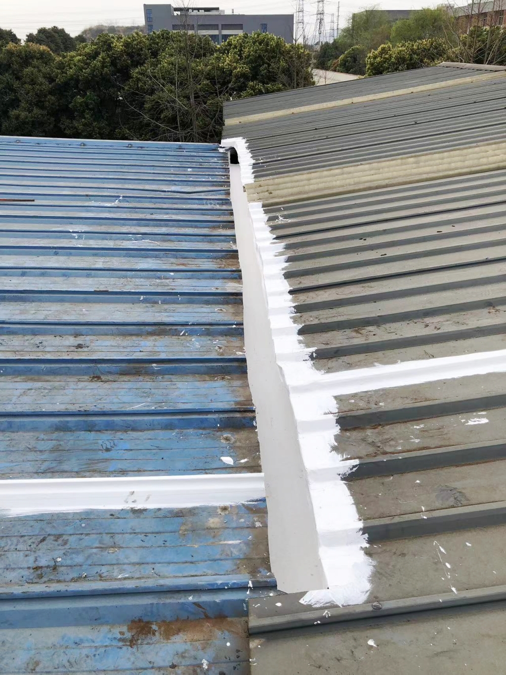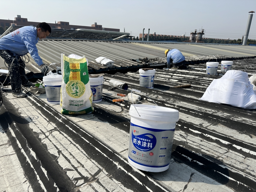 對于彩鋼頂斜坡表面彩鋼搭接縫的漏水問題,公司同樣采用了SYR金屬屋面專用防水涂料配合專用縫織聚酯布進行一布三涂的施工處理。這種施工方法不僅能夠有效密封搭接縫隙,防止水分滲透,還能夠提高彩鋼頂的整體防水性能。