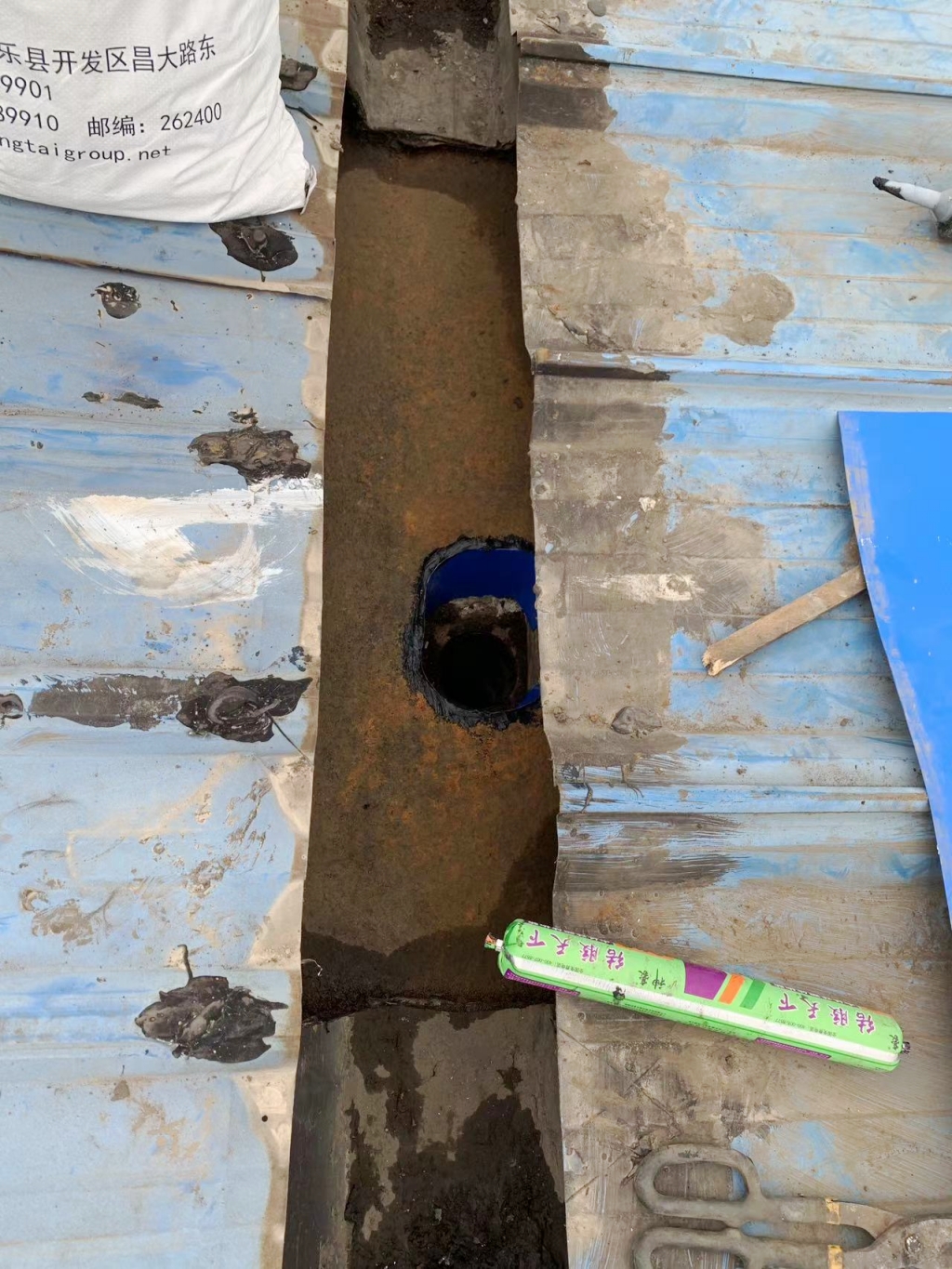 美康三杉木業有限公司的廠房彩鋼頂此前存在嚴重的漏水問題。雖然之前已經有人在彩鋼頂表面鋪設了自粘瀝青防水卷材,并在天溝內額外貼了一層彩鋼瓦,并再次進行了改性瀝青防水卷材的鋪設,但漏水現象依然沒有得到有效解決。面對這一棘手的挑戰,成都蜀禹建筑防水工程有限責任公司迅速組織技術團隊進行現場勘察,并制定了針對性的防水補漏方案。