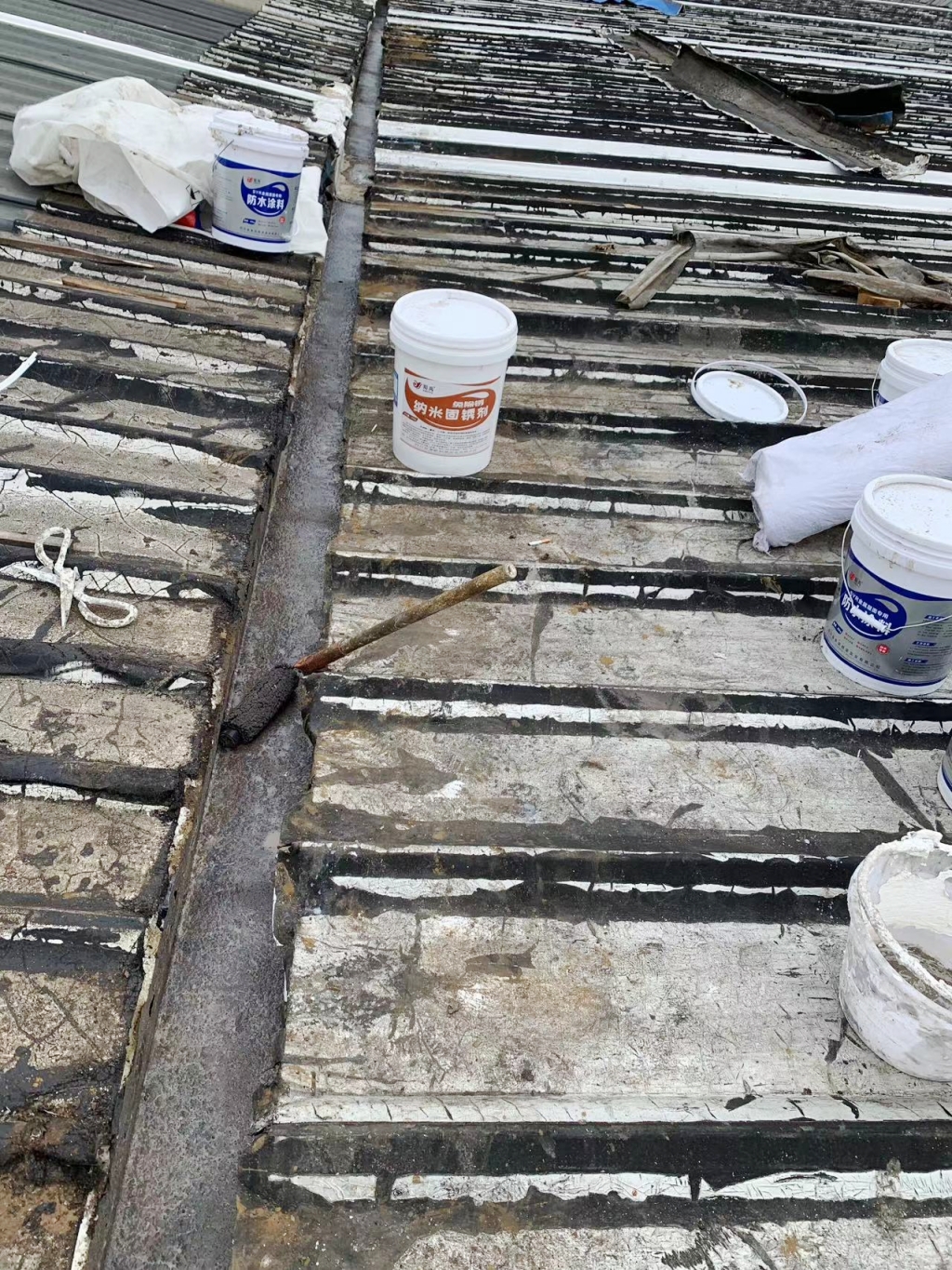 在施工過程中,公司技術團隊首先揭掉了天溝內的瀝青防水卷材,發現下方天溝已經銹蝕嚴重,出現了多處穿孔。針對這一問題,團隊先對天溝進行了除銹處理,并涂刷了免除銹納米固銹劑,有效阻止了銹蝕的進一步發展。隨后,團隊在天溝內涂刷了SYR金屬屋面專用防水涂料,并鋪貼了專用縫織聚酯布,以增強防水層的韌性和耐久性。最后,再在天溝表面涂刷了兩遍SYR金屬屋面專用防水涂料,確保防水效果達到**。