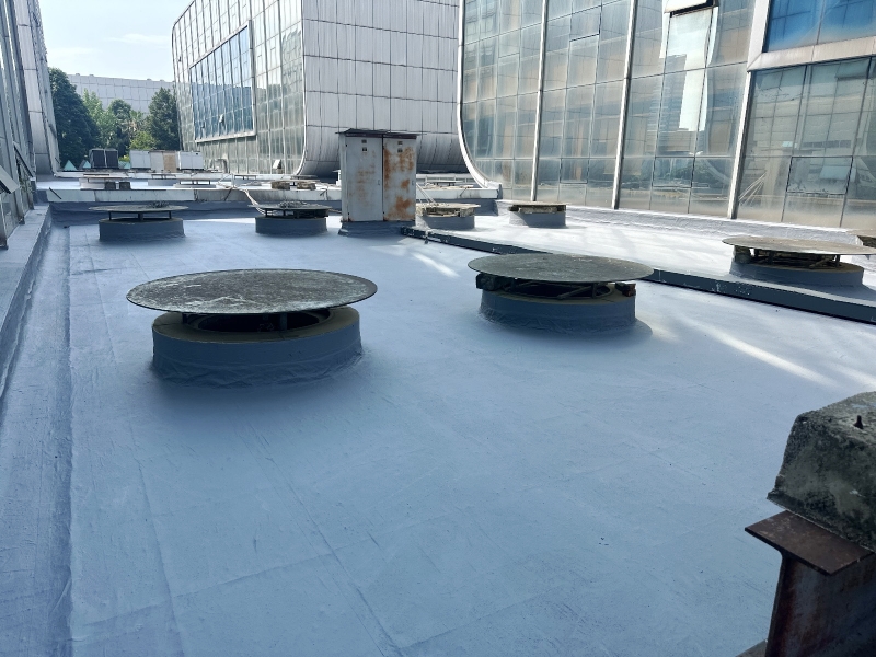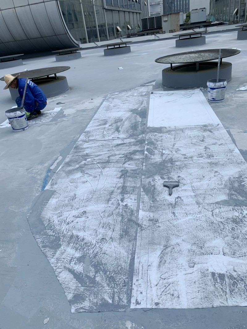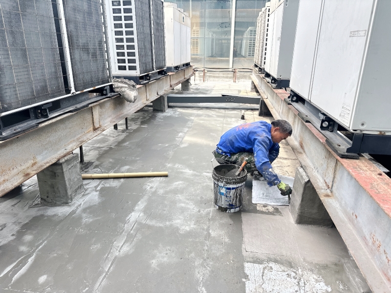 基層處理:首先,施工團隊對屋頂表面基層進行了徹底的清理,確保無灰塵、油污等雜質,為后續防水層施工打下堅實基礎。針對基層表面的局部不平整和翻砂現象,進行了砂漿修補和涂刷混凝土液體硬化劑處理,有效增強了基層的強度和穩定性。