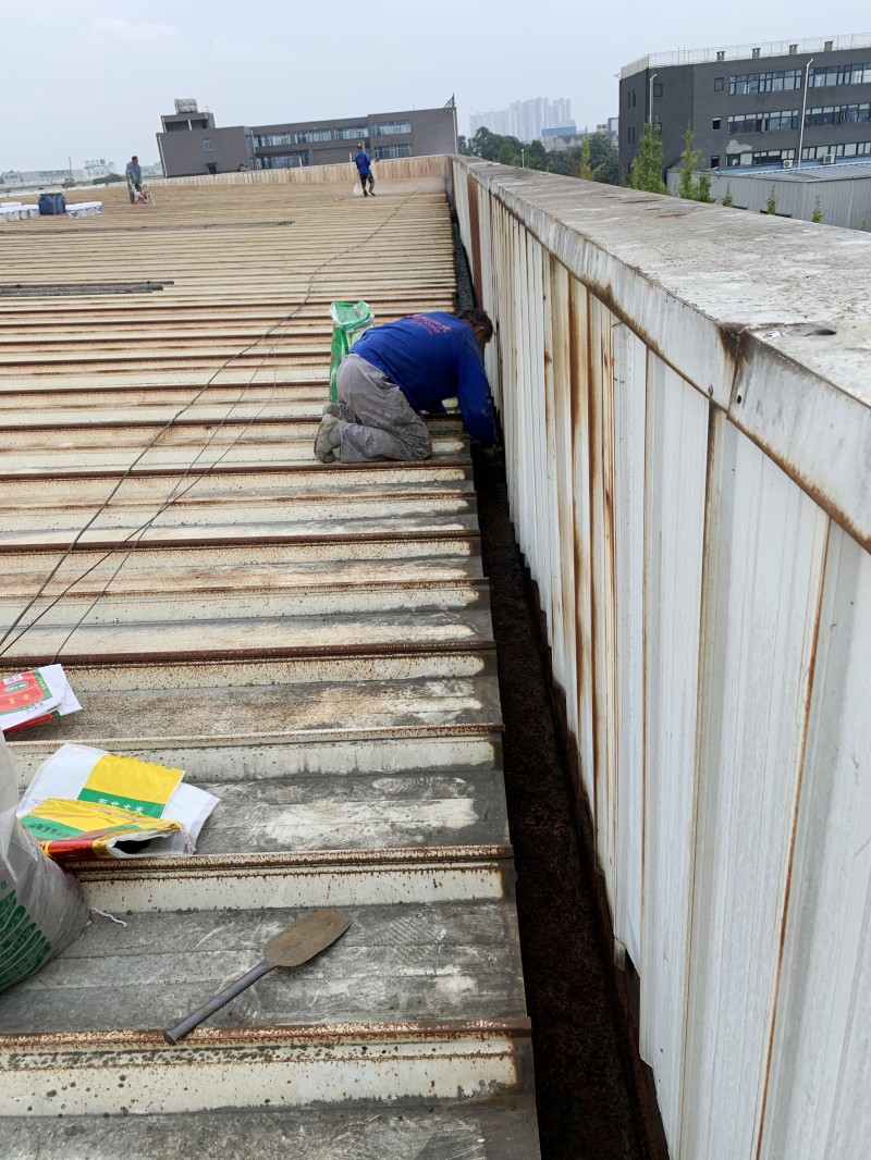 在施工前,蜀禹防水公司的專業團隊首先對廠房的彩鋼瓦屋面和天溝進行了徹底的清理。他們清除了表面的污垢、銹跡和舊防水層,確保基面干凈、平整,為后續的防水施工打下了堅實的基礎。