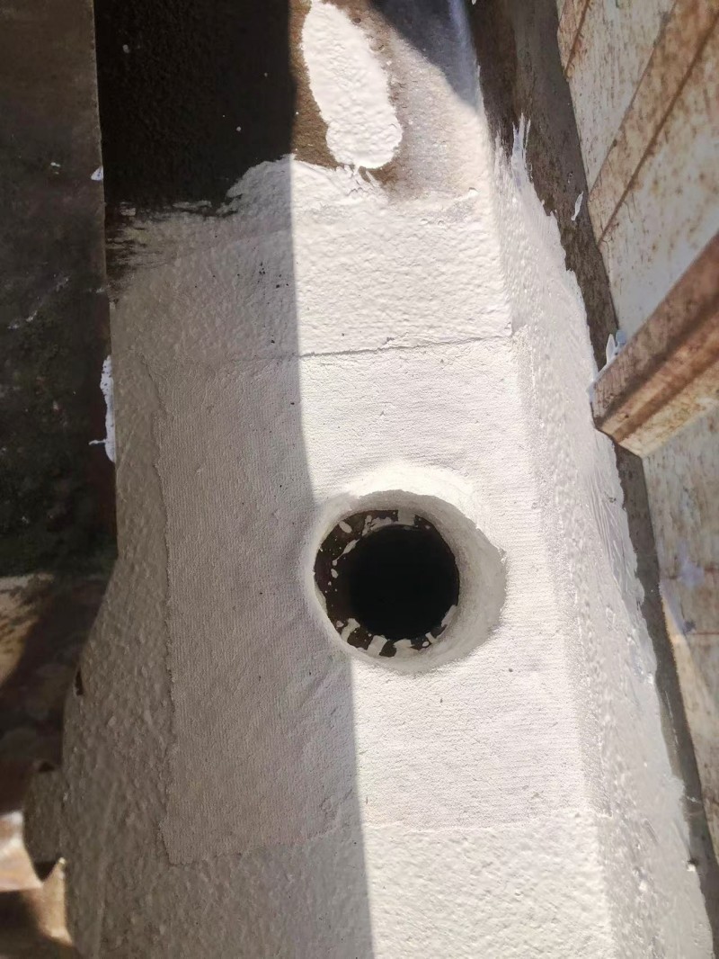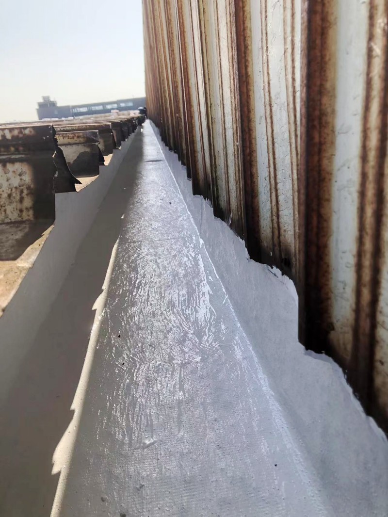對于天溝這一重點防水區域,蜀禹防水公司更是進行了特別的關注。他們清理干凈基層并涂刷了納米固銹劑之后,針對下水口位置重點處理,然后不僅在天溝內滿涂刷了SYR金屬屋面防水涂料,還滿鋪貼了專用縫織聚酯布。這種組合方式不僅能夠有效防止水分滲透,還能夠增強天溝的強度和耐久性,防止其因銹蝕而脫層。