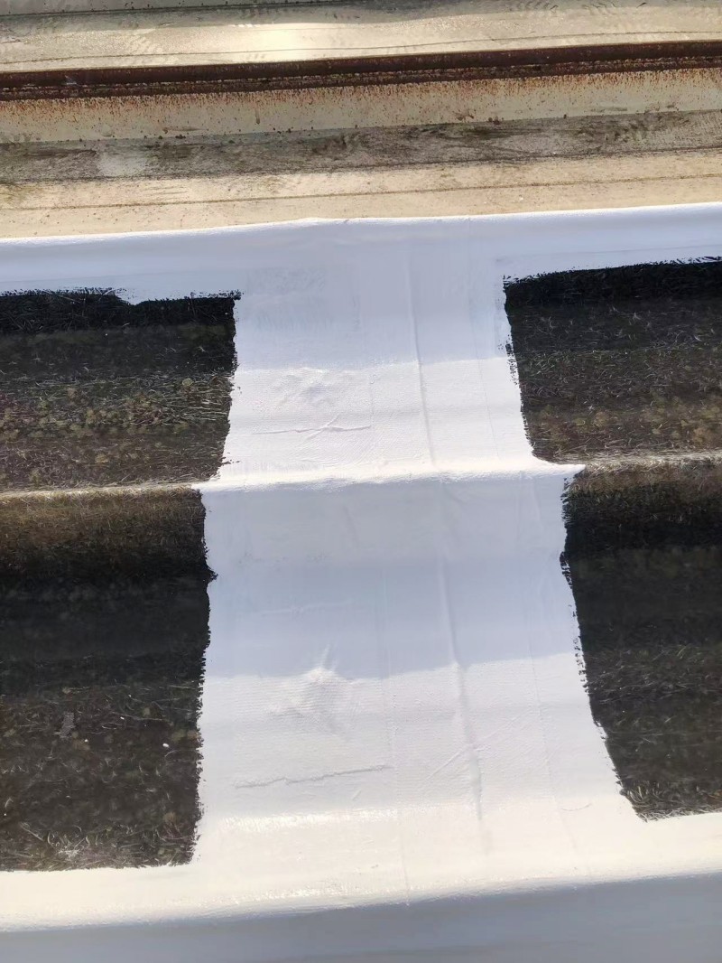 在彩鋼瓦表面的搭接縫處,蜀禹防水公司也采用了SYR金屬屋面防水涂料配合縫織聚酯布進行重點防水密封處理。這一步驟能夠確保搭接縫處的密封性,防止水分從縫隙中滲入,從而進一步提高整個彩鋼頂的防水性能。
