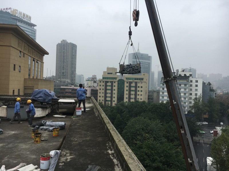 以下為四川省人大常委會辦公廳會議室屋頂防水采用PET濕鋪防水卷材施工現場部分照片: